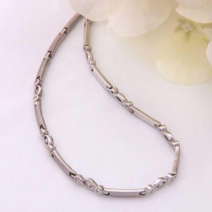 Sie hat stabförmige Glieder mit Zwischengliedern, welche je aus einem navetteförmigen und 2 runden Gliedern besteht. Diese sind komplett mit Brillanten besetzt. In den navetteförmigen Gliedern sind die Edelsteine je 0,02ct und in den runden je 0,01ct.