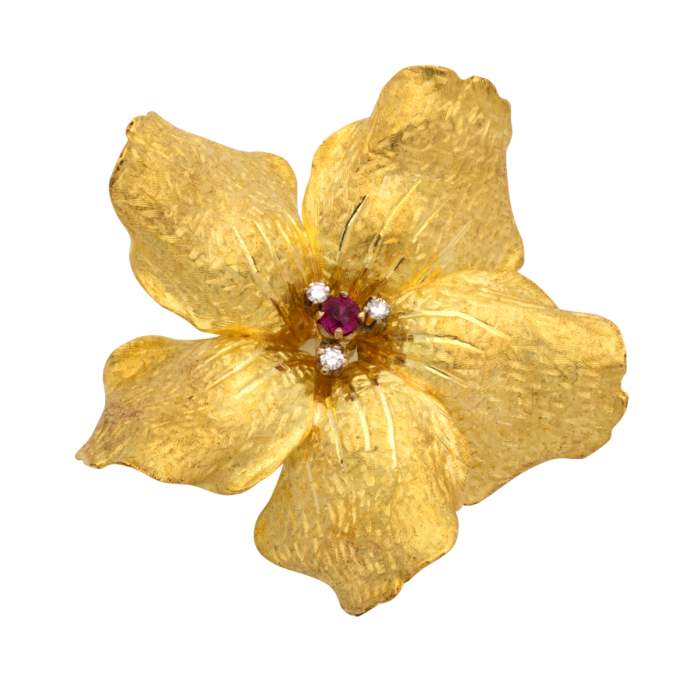 Traumhafte Goldschmiedearbeit. Die Brosche, vollplastisch gearbeitet, hat die Form einer Blüte.