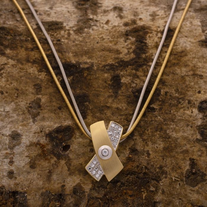 2 zusammengefasste Schlangenketten – eine in Gelbgold, eine in Weißgold – passt sich dem Anhänger wunderbar an.