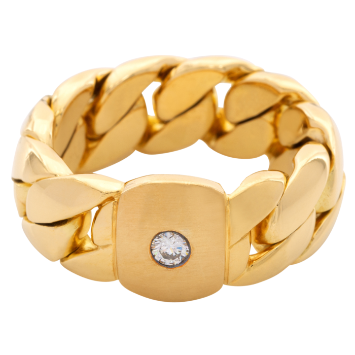 Der bewegliche Panzerring in 750er Gelbgold besteht aus massiven 7 mm breiten Gliedern. Schauseitig ist eine eckige 8x10 mm große Platte mit gerundeten Ecken eingearbeitet, die besetzt ist mit einem eingeriebenen Brillanten von ca. 0,10 ct. (W, VSi2).