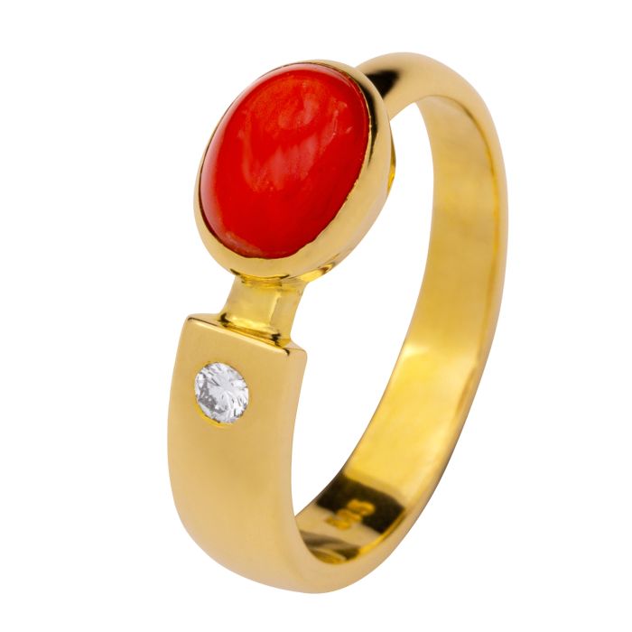 Die hochglanzpolierte Ringschiene fasst schauseitig einen Korallcabochon in ovaler Form in Zargenfassung und einen Brillant von 0,07 ct. in eingeriebener Fassung.