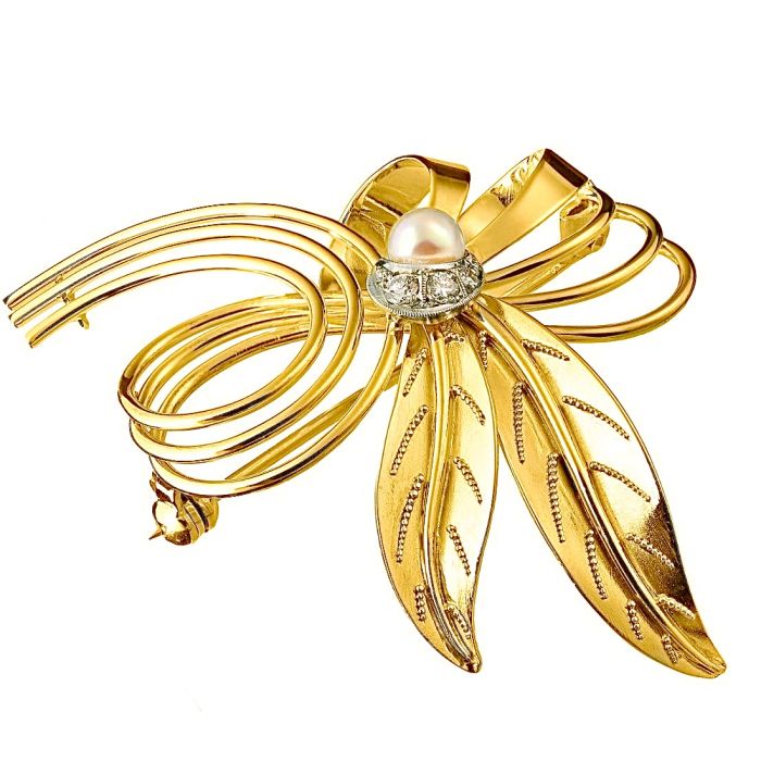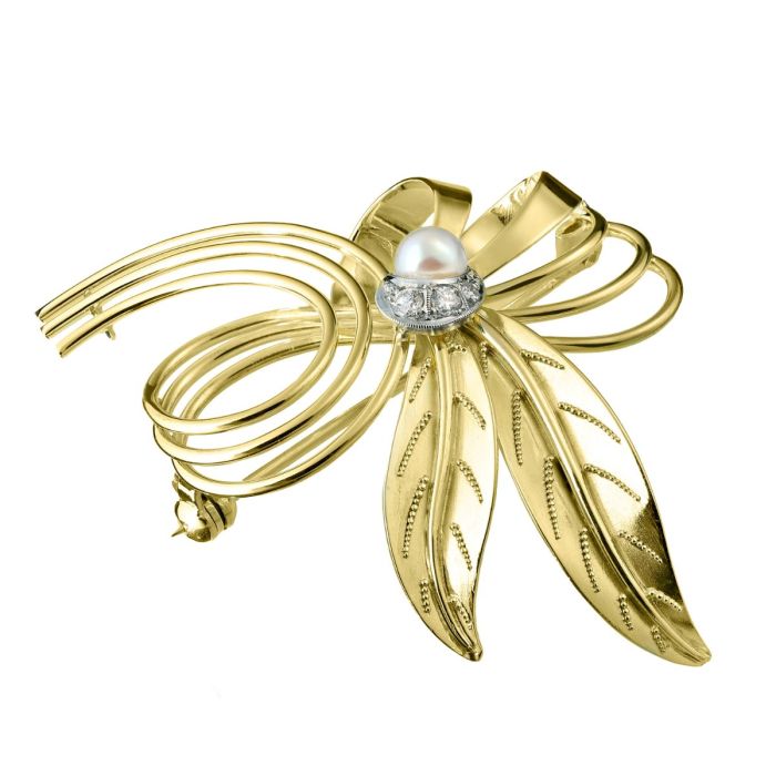 Florale Brosche, um 1950, aus rundem Golddraht und Goldband mit zwei modellierten Blättern, tlw. granuliert.