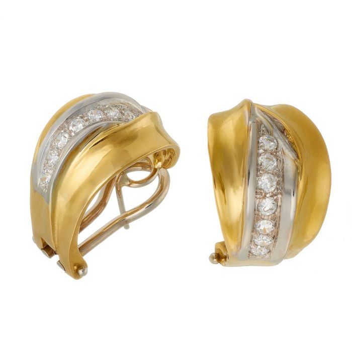 Das Schaustück ist teilweise rhodiniert in Weißgold und fasst je 7 Brillanten, die dem Betrachter entgegenfunkeln.