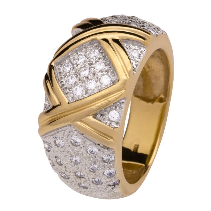 Ein Rauteförmiges Band in Gelbgold legt sich darüber und macht den Ring zusätzlich zu einem echten Hingucker.