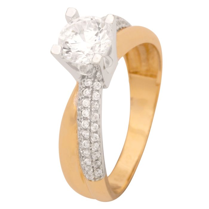 Das Schmuckstück hat eine weißgoldene Krönchenfassung in der ein leuchtender Zirkonia sitzt. Rechts und links davon funkeln ebenso Zirkonia auf der gedrehten Ringschiene.