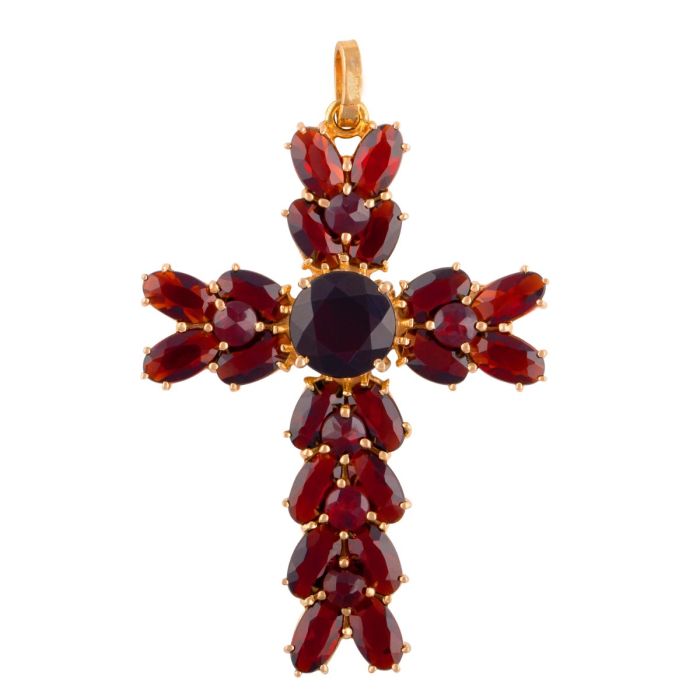 Dieses Schmuckstück ist komplett besetzt mit insgesamt 27 Granatsteinen in verschiedenen Schliffen. Alle sind in Krappenfassungen.