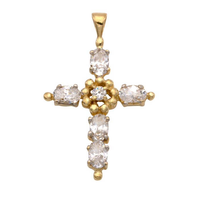 Das Schmuckstück ist besetzt mit Zirkonia in Ovalschliff in Krappenfassungen entlang des Quer- und Längsbalken.