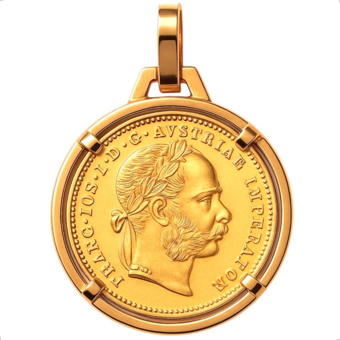 Österreichiche1 Dukat Münze aus 986er Gelbgold in einer schlichten Fassung aus 750er Gelbgold. Der Ketteanhänger ist ein schönes Accessoire, welches sich sowohl an langen als auch an kurzen Ketten gut tragen lässt.
