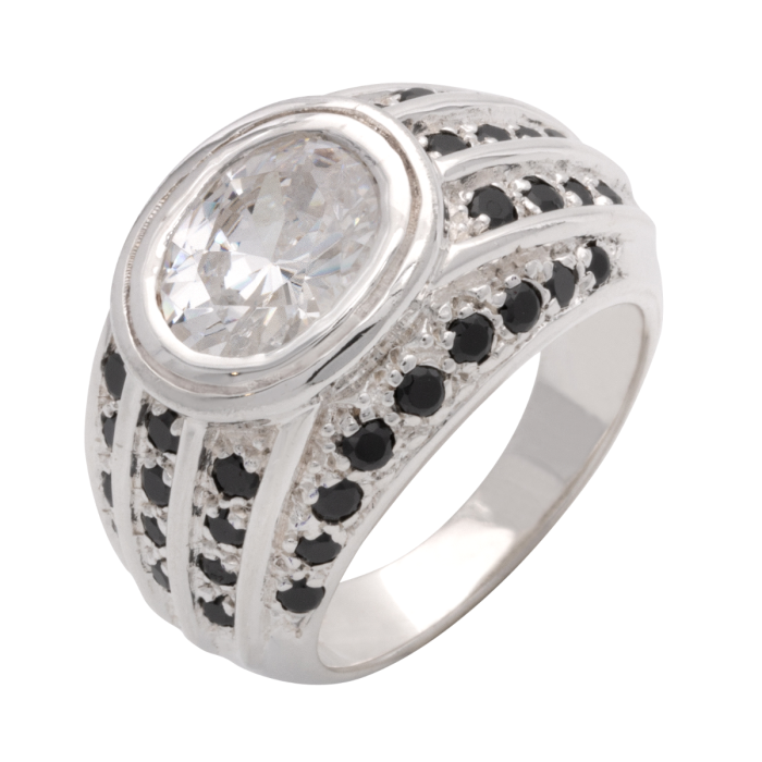 Ein großer weißer Zirkonia in Zargenfassung ist das Mittelstück. Entouriert wird er von kleinen schwarzen Steinen, welche sich wundervoll absetzen.