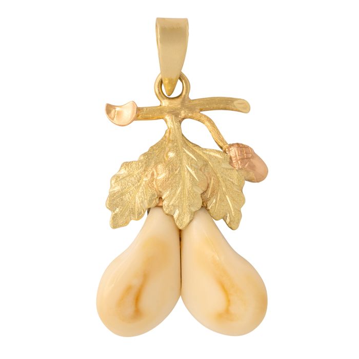Das Schmuckstück fasst ein Grandelpaar (bezeichnet den Eckzahn von Wiederkäuern), welche umgeben von filigran gearbeitetem Eichenlaub aus leicht grünlich schimmerndem Gold sind.