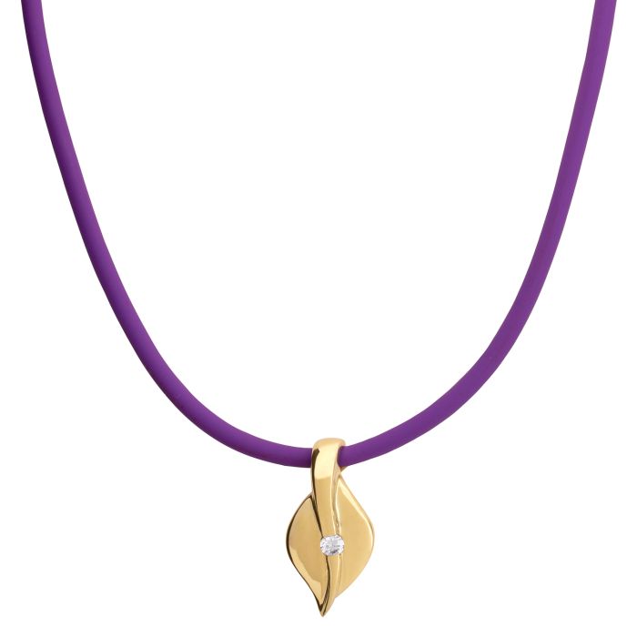 Eine violette Silikonkette mit vergoldetem Bajonettverschluss bringt den Halsschmuck den zusätzlichen, besonderen Touch.