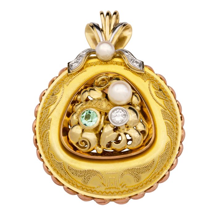 Bei dieser - im Ursprung antiken - Goldschmiedetechnik werden kleinste Gold- oder Silberkügelchen auf ein Edelmetall so aufgelötet, dass sie nur an ihren jeweiligen winzigen Berührungspunkten miteinander verbunden sind. Der liebevoll gestaltete innere Teil wird zusätzlich von einem Turmalin, einem Brillanten von 0,20 ct. und einer Zuchtperle geziert.