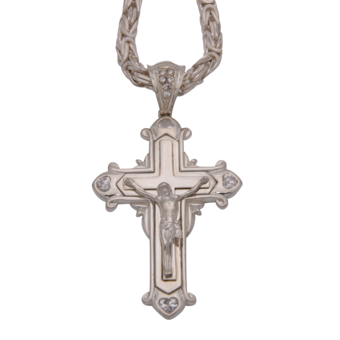 Das massive Schmuckstück hat an den Endstücken herzförmige Zirkonias gefasst. Der gekreuzigte Jesus ist im unteren Teil des Kreuzes aufgebracht. Die große Öse ist mit Zirkonias besetzt.