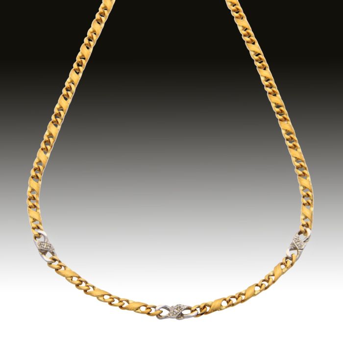 Im mittleren Teil sind 3 etwas größere weißgoldene Glieder in gleichmäßigen Abständen eingefügt. Diese sind mit jeweils 2 Diamanten besetzt.