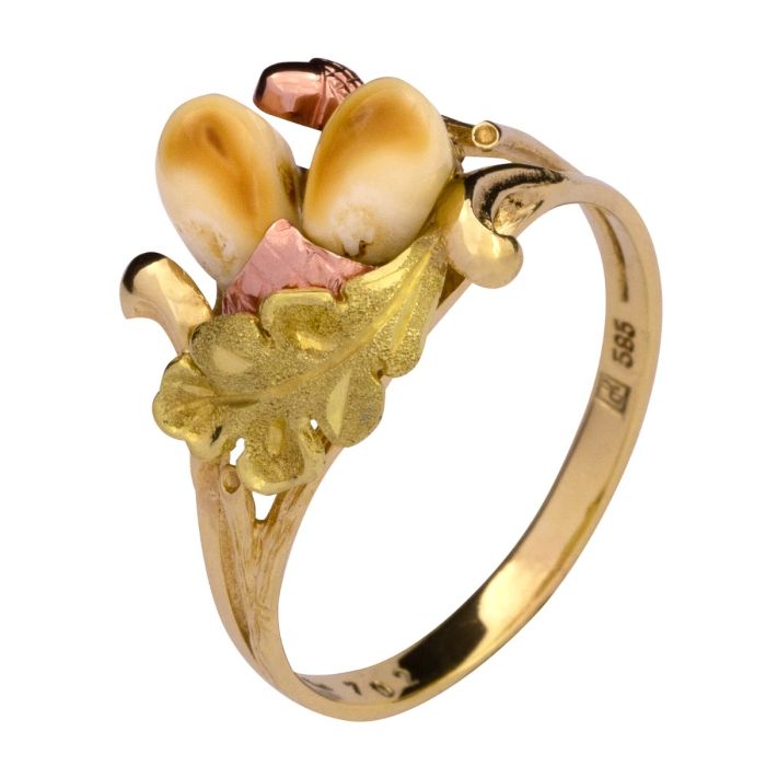 Schauseitig trägt der Ring Grandeln (bezeichnet den Eckzahn von Wiederkäuern) welche umgeben von filigran gearbeiteten Eichenlaub aus Rotgold und grünstichigen Gold sind.