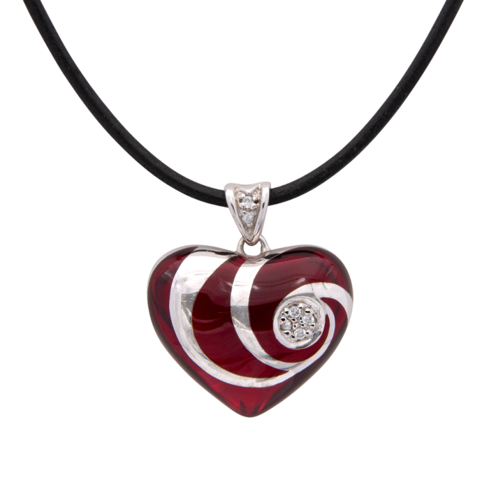 Das rote Herz aus Kunstharz hat eine zirkoniabesetzte Öse und Overlay aus Sterling-Silber. Das Silber legt sich schwungvoll über den vollplastischen Herzkorpus und konzentriert sich in einem vertieften Kreis, der mit 4 kleinen Zirkonia besetzt ist.