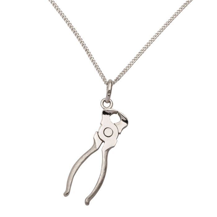 Anhänger in Form einer Zange in 925er Silber inkl. 2-seitig geschliffener Flachpanzerkette, die hochglanzpoliert ist.