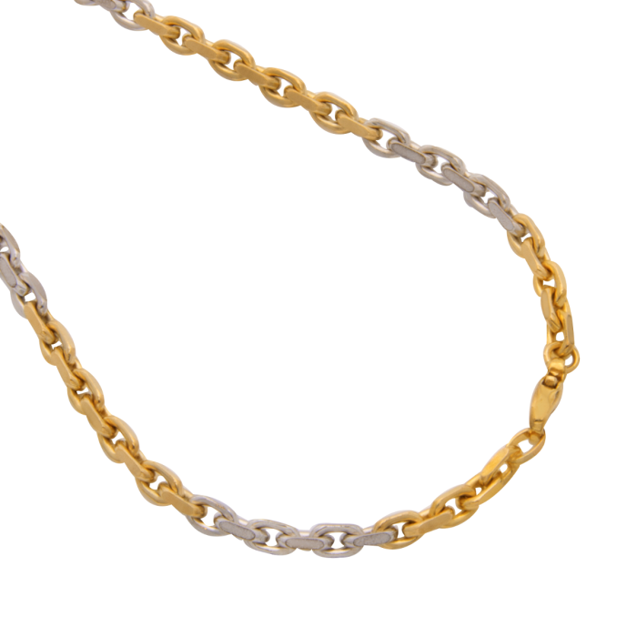 Das Schmuckstück hat abwechselnd je 6 weißgoldene und 8 gelbgoldene kantig gearbeitete Ankerglieder.