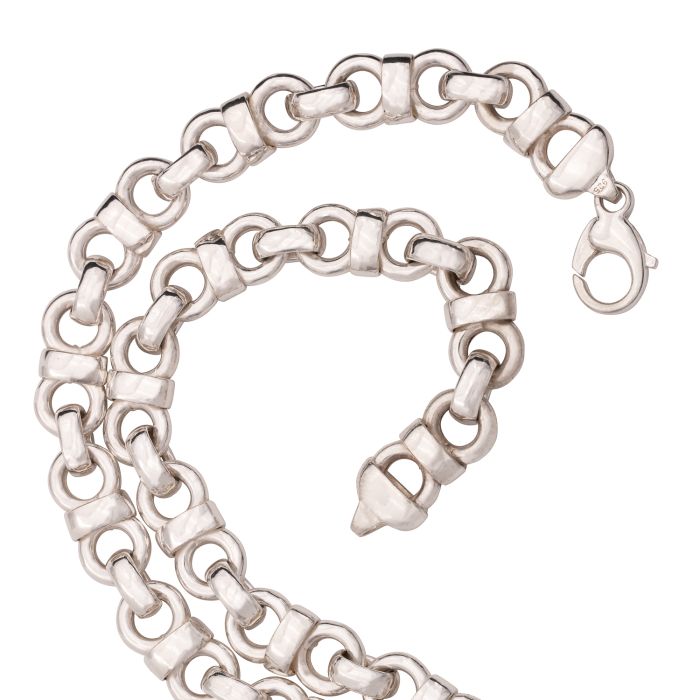 Bewegliche Zwischenglieder lassen die Kette am Hals gut liegen. Ein großer Karabiner dient als Verschluss.