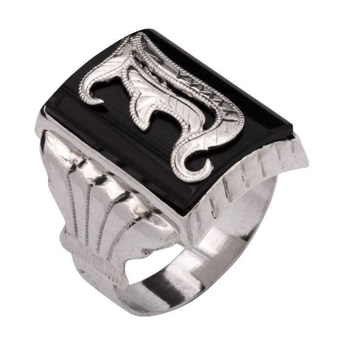 Das Schmuckstück hat auf einem halbrund gewölbten rechteckigen Onyx in Zargenrahmen, eine fein ziselierte Initiale „J“ appliziert.