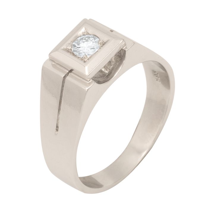 Die hochglanzpolierte Ringschiene geht in den quadratisch gearbeiteten Ringkopf über. In diesem thront ein funkelnder Brillant von ca. 0,30 ct. in einer ebenfalls quadratischen Fassung, die auf den Ringkopf aufgesetzt ist.