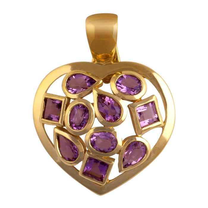 Das hochglanzpolierte Schmuckstück mit seinem herzförmigen Rahmen fasst in Zargenfassungen im Inneren des Herzens mehrere Amethyste in verschiedenen Formen.