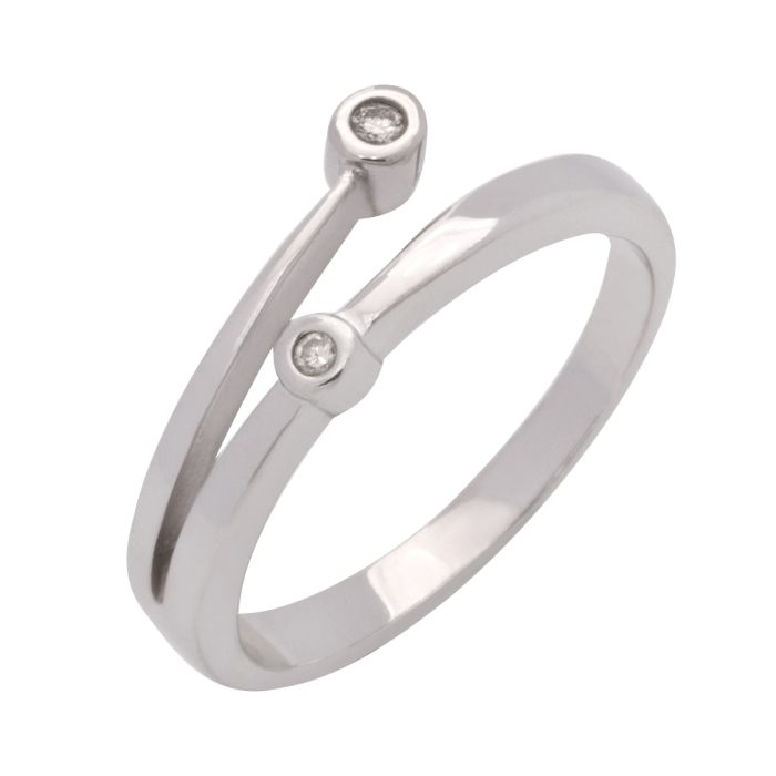 Der ca. 2-4 mm breite und glänzend polierte Vierkantring teilt sich schauseitig in asymmetrischer Form und ist besetzt mit zwei kleinen Brillanten von je 0,01 und 0,03 ct. (Crystal, VSi).
