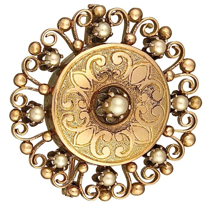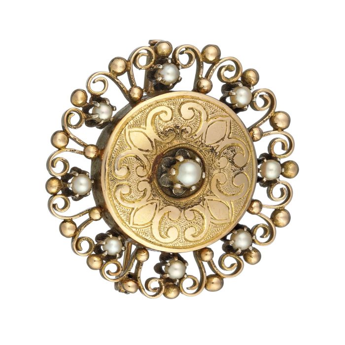 Die Brosche ist mittig flächig umrandet von einer filigran gearbeiteten Ranke, die von kleinen Naturperlen geziert wird.