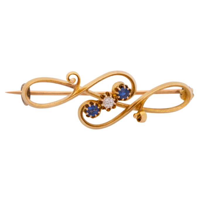 Besetzt ist es mit 1 Altschliff-Brillanten (0,03 ct.), welcher flankiert von je einem Saphir in facettiertem Rundschliff ist.