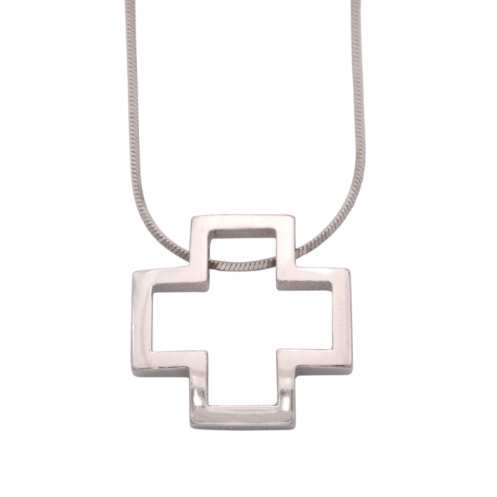 Ein gleichseitiges offenes Kreuz mit glänzend poliertem Rahmen, an einer feinen Vierkant-Schlangenkette mit Karabinerverschluss, begeistert in seiner Schlichtheit.