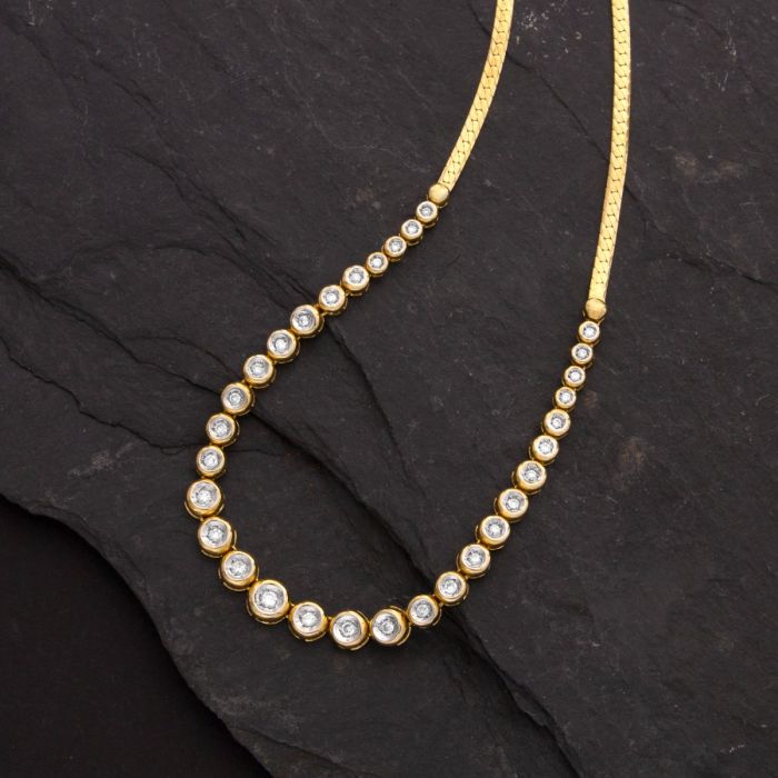 Zur Mitte hin werden die runden Glieder und die darin sitzenden Brillanten größer. Ein wundervoller Halsschmuck, der sich perfekt eleganter Kleidung anpasst.
