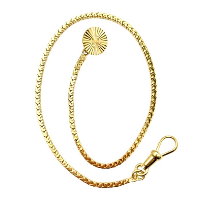 Schöne Knopflochkette in 585er Gelbgold. Das Knopflochendstück hat ein tolles strahlenähnliches Dekor. Der Karabiner wird an der Uhr befestigt. Ein attraktives Accessoire für Ihren Taschenuhr.