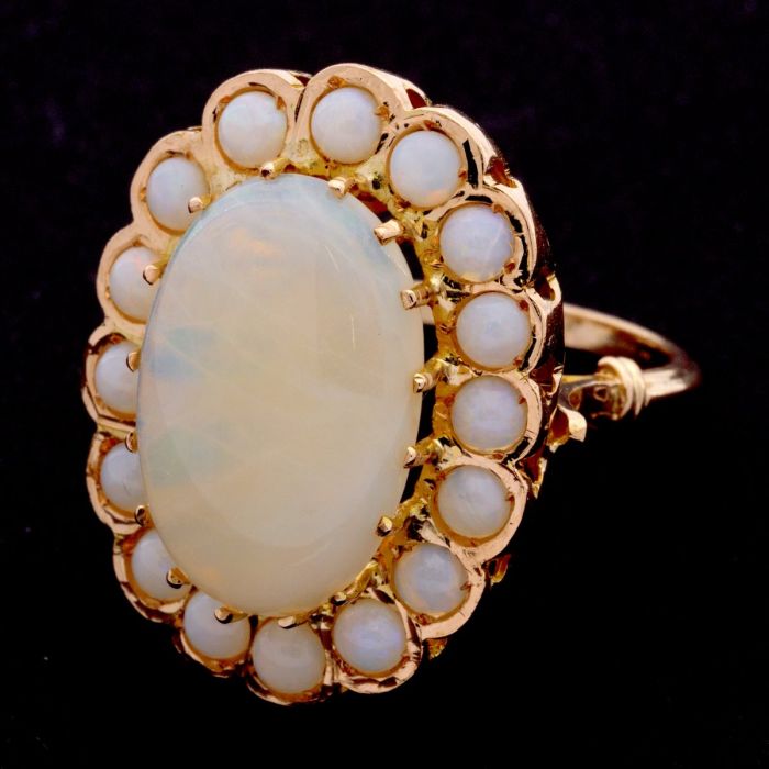 Er fasst mittig einen hellen Opal. Dieser wird entouriert von 16 kleinen, runden Opalen.