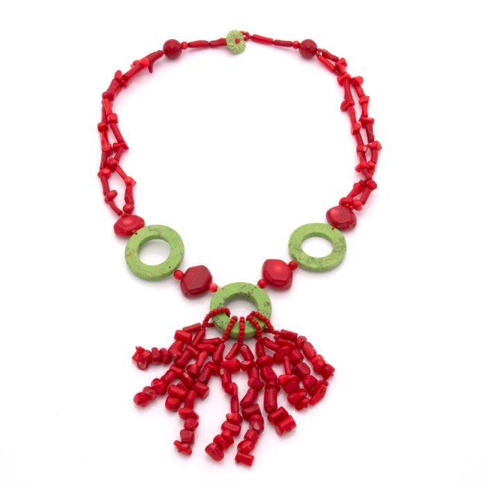 Auffallende Korallen-Kette in leuchtendem Rot mit runden Elementen aus grünem Magnesit.