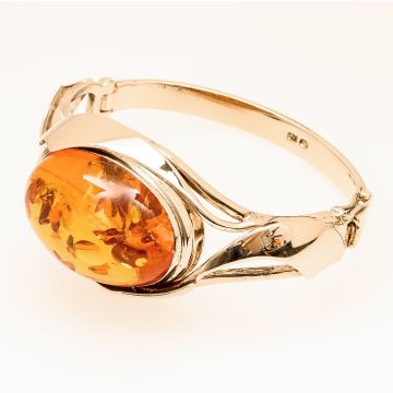 • Handgefertigter Armreif in vergoldetem Silber. Mittig hat das Schmuckstück einen großen Bernstein gefasst.