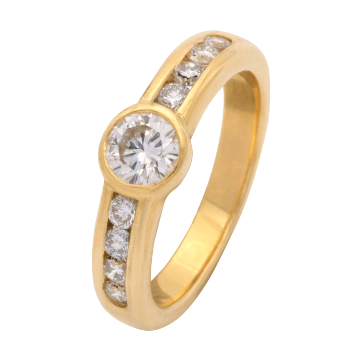 Das Schmuckstück fasst einen großen Brillanten von ca. 0,70 ct. in einer Zargenfassung mittig.