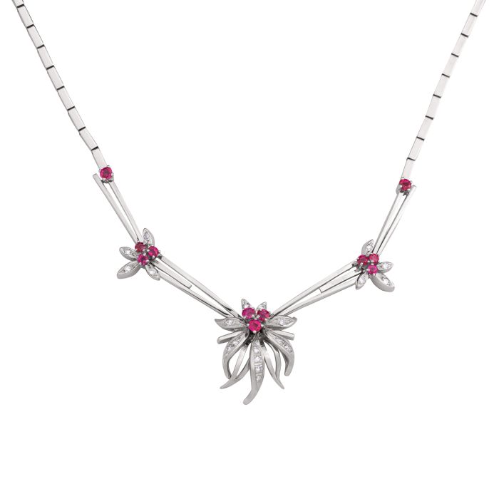 Die blütenartigen Elemente fassen jeweils Rubine und Diamanten und lassen den Halsschmuck damit zusätzlich strahlen.