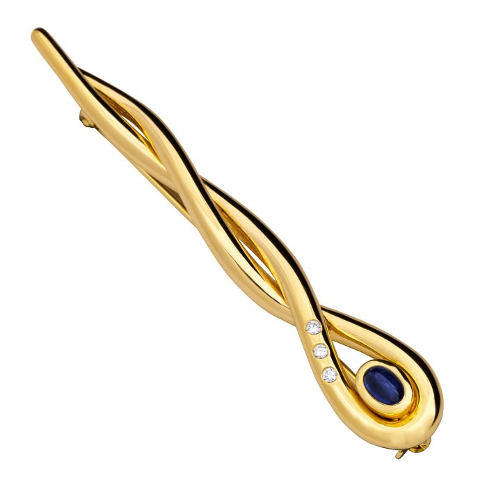 In der Rundung am Ende der Brosche sitzt ein blau leuchtender Saphir in Cabochonschliff in einer Zargenfassung. Seitlich begleitet wird dieser von 3 Brillanten von 0,06 ct.