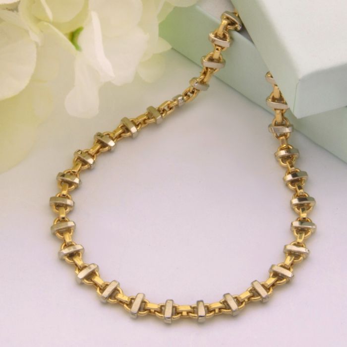 Jedes gelbgoldene Glied ist mit einem weißgoldenen Steg darüber versehen und macht es somit zu einem echten Eyecatcher.