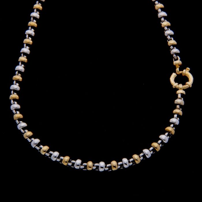 Der unterliegende Kettenteil ist in Weißgold gehalten. Die einzelnen, aufgesetzten Glieder darüber sind rund und abwechselnd in Gelb, und Weißgold gehalten.