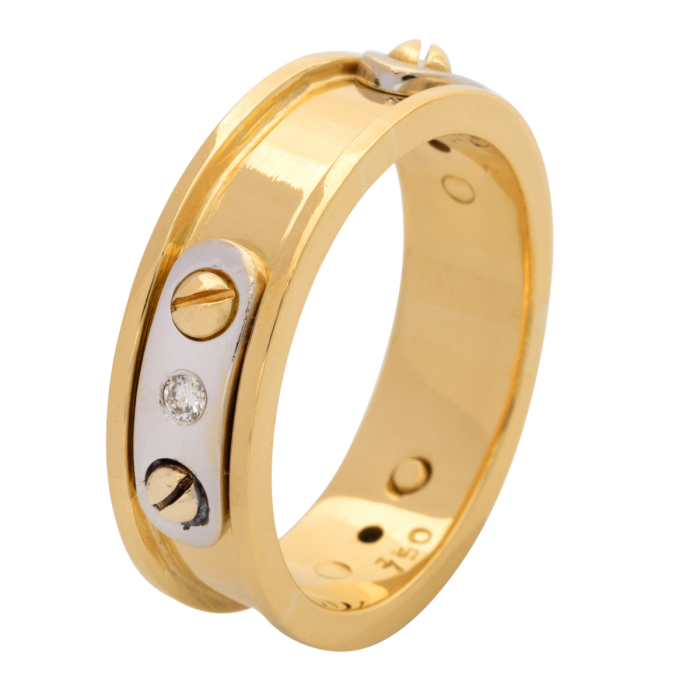 Der glänzend polierte massive Ring ist mittig vertieft und besetzt mit drei gerundeten Dekorplättchen in Weißgold mit je zwei gelbgoldenen gewölbten Schraubenköpfen und einem eingeriebenen Brillanten von ca. 0,04 ct. Die obere und untere Randeinfassung misst jeweils 1 mm in Breite und Stärke.