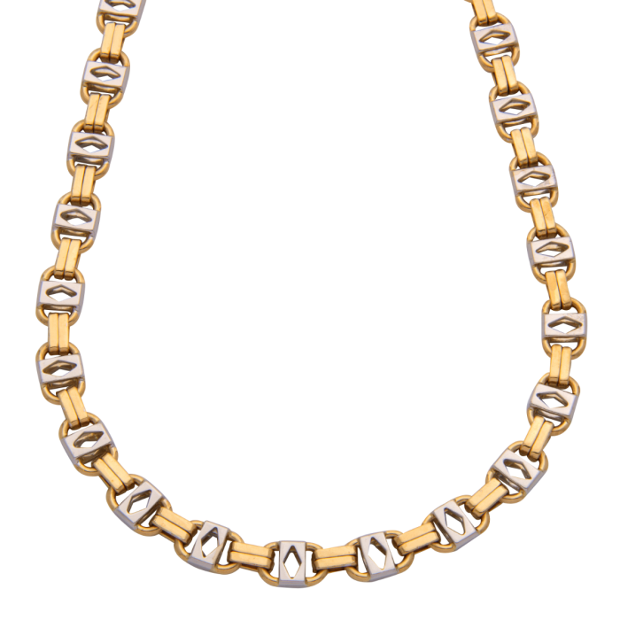 Das Schmuckstück hat hochglanzpolierte, phantasievolle Glieder, welche in Gelb- und Weißgold gearbeitet sind.