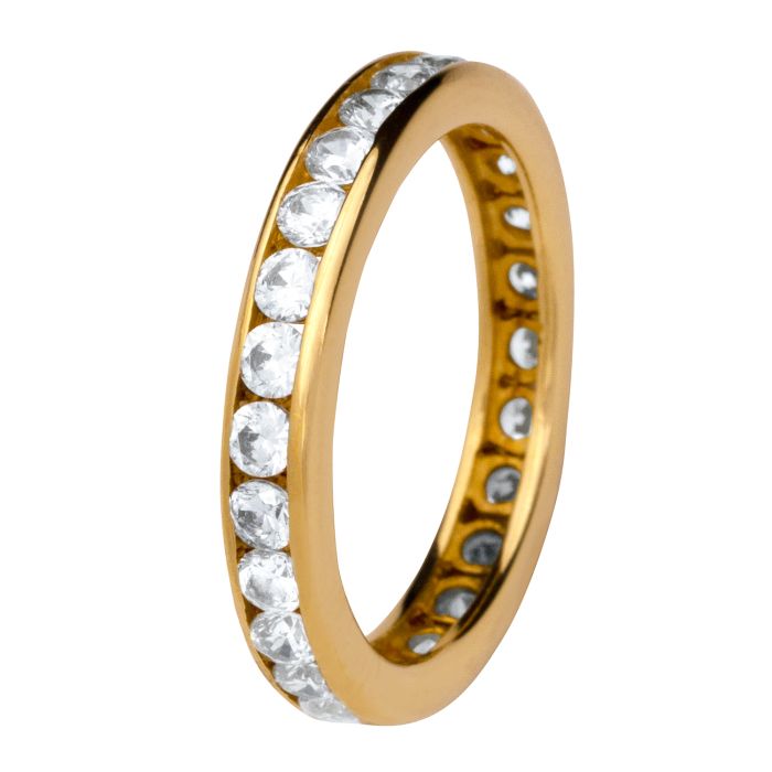 Das Schmuckstück ist hochglanzpoliert und fasst 26 Zirkonia ringsherum in Kanalfassung.