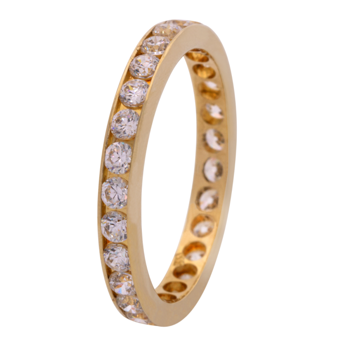 Der Simili-Memory-Ring mit 27 funkelnden Zirkonia in Kanalfassung ist auf den ersten Blick nicht von einem echten Memoire Ring zu unterscheiden.