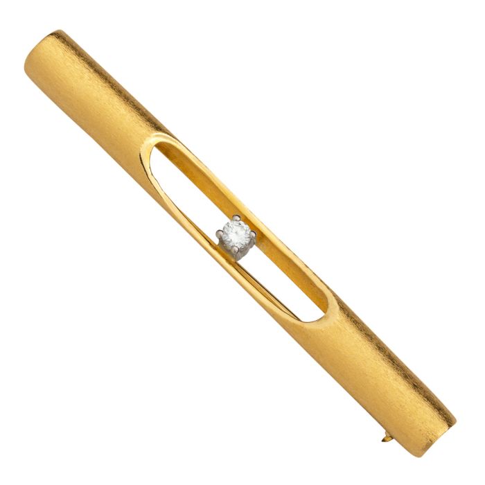 Moderne Stabbrosche in 14-karätigem Gelbgold. Das handgearbeitete Schmuckstück ist satiniert und mittig offen. In der Öffnung funkelt ein Brillant von 0,04 ct. in Krappenfassung.