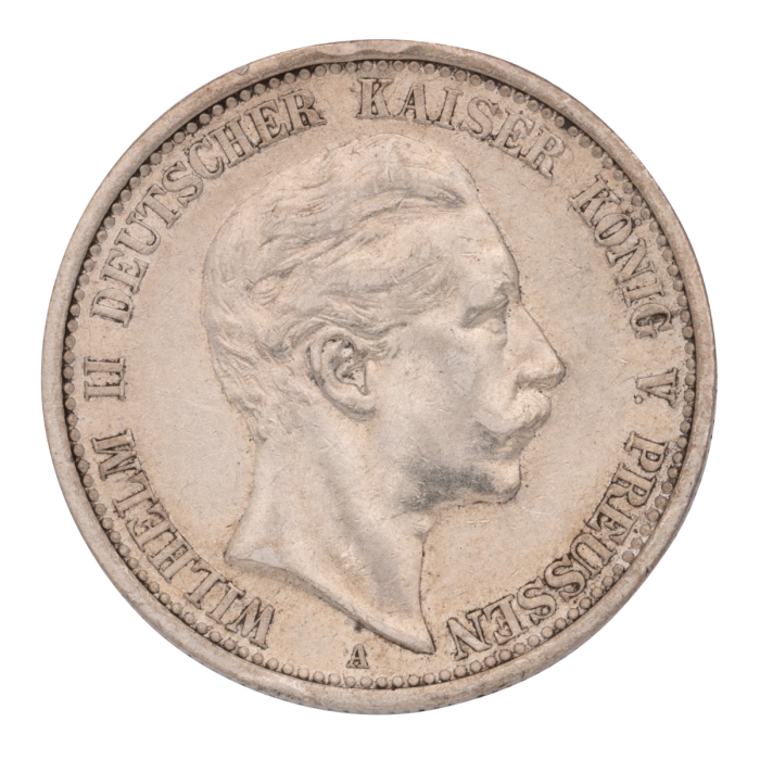 Avers: Profil nach rechts von Kaiser Wilhelm II. über dem Kürzel der Prägestätte mit Umschrift WILHELM II DEUTSCHER KAISER KÖNIG V. PEUSSEN
