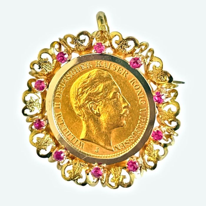 Die aufwändig gestaltete Fassung für eine 20-Mark-Münze (Deutsches Reich, Preußen 1905) hat einen in Weißgold abgesetzten breiten Rand und ist verziert mit einem durchbrochen gearbeitetem Kranz in stilisierter Herzform, besetzt mit 10 rund facettierten Rubinen. Broschierung mit Sicherheitsverschluss und Öse. Dadurch kann es als Brosche oder als Anhänger genutzt werden.