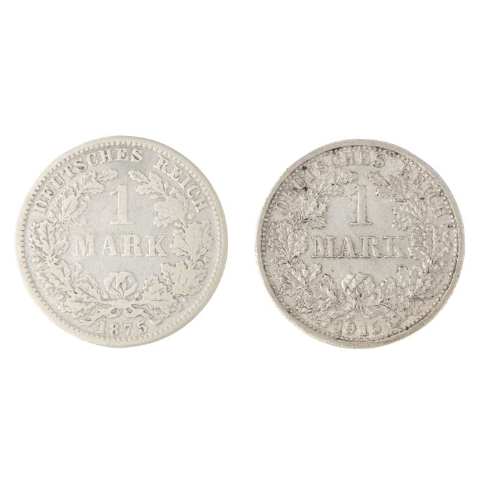 Die Silbermünze 1 Mark des deutschen Kaiserreichs wurde von 1873 – 1916 als Umlaufmünze geprägt. Die Herstellung erfolgte in neun Prägestätten: Berlin (A), Hannover (B), Frankfurt (C). München (D), Dresden (E), Stuttgart (F), Karlsruhe (G), Darmstadt (H) und Hamburg (J). Die Vorderseite zeigt kein Portrait, da diese nicht von den einzelnen Bundesstaaten ausgegeben wurden. Die Angaben 1 Mark (gerahmt in Eichenlaub), Deutsches Reich, sowie das Prägejahr umgeben mit einem Perlrand, zieren die Vorderseite. Die Rückseite bildet den Reichsadler ab (kleiner Adler mit großem Wappen bis 1889 – großer Adler mit kleinem Wappen ab 1891).