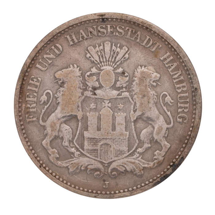 Avers: Stadtwappen über dem Kürzel der Prägestätte und Umschrift „FREIE UND HANSESTADT HAMBURG“