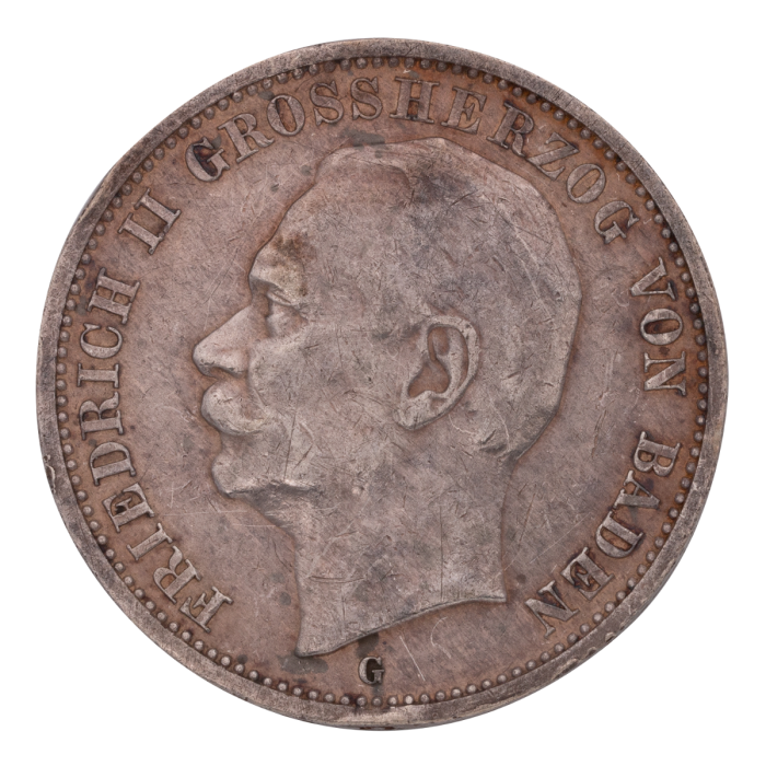 Avers: Profil nach links von Großherzog Friedrich II. über dem Kürzel der Prägestätte mit Umschrift FRIEDRICH GROSHERZOG VON BADEN.
